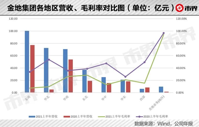 在今年上半年的业绩会上,金地高级副总裁兼财务负责人韦传军就毛利率下降进行解释,称主要与本期结转结构有关,位于杭州、天津、合肥等低毛利地区的7个项目在本期集中结转,占房地产开发结转收入的比例超过50%,这些项目的结转毛利率仅为8.7%。