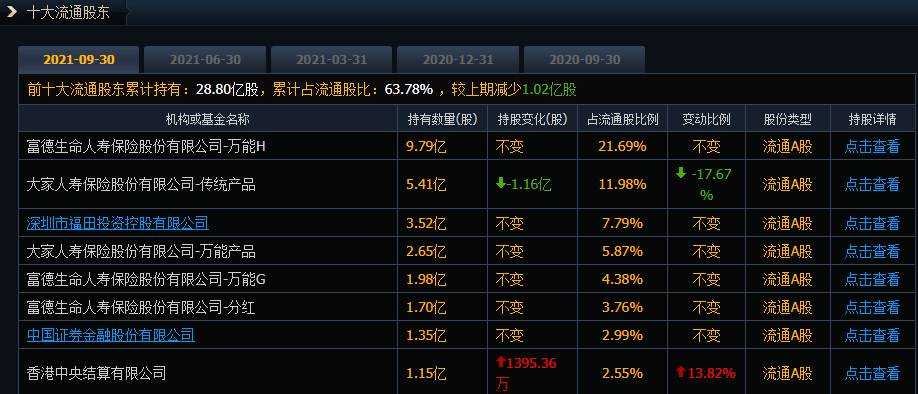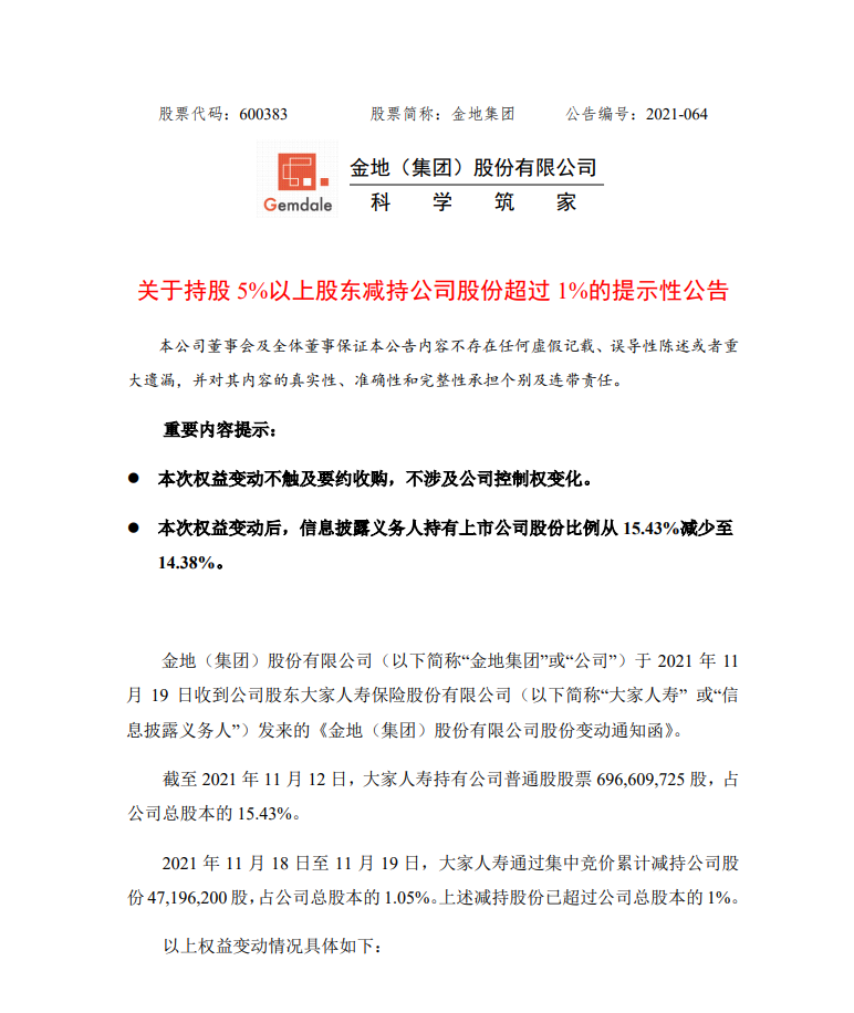 公告显示,在本次权益变动前,大家人寿合计持有金地集团约6.97亿股股份,占金地集团总股本的15.43%;在本次变动后,大家人寿合计持有金地集团约6.49亿股股份,占其总股本的14.38%。