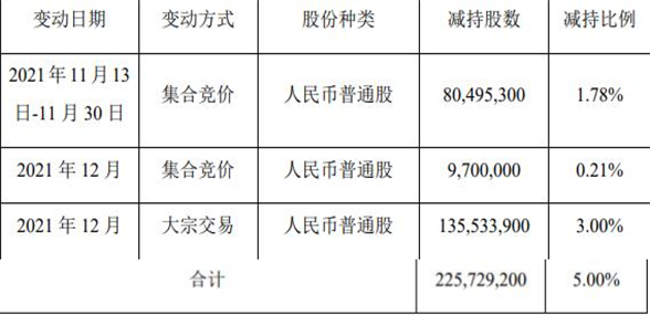 其中,截至2021年11月12日,大家人寿持有公司普通股股票6.97亿股,占公司总股本的15.43%;自2021年11月18日至11月19日,大家人寿通过集合竞价累计减持公司股份4719.62万股,占公司总股本的1.05%;自2021年11月20日至11月末,大家人寿通过集合竞价方式转让3329.91万股,占公司总股本的0.74%;2021年12月,大家人寿通过集合竞价方式转让970万股,占公司总股本的0.21%;通过大宗交易方式转让1.36亿股,占公司总股本的3.00%。自11月20日提示性公告披露后,大家人寿累计减持公司股份1.79亿股,占公司总股本的3.95%。
