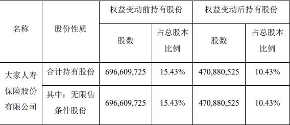 自2021年11月13日至今,大家人寿保险股份有限公司累计减持公司股份2.26亿股,占公司总股本比例达到5%;权益变动后,其持有公司股份比例下降至10.43%。
