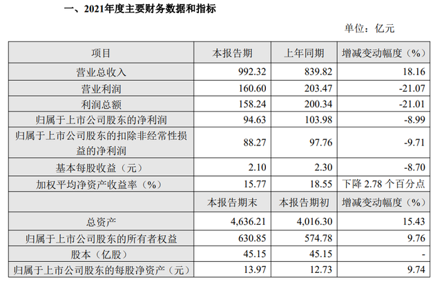 2021年,金地集团实现营业收入992.32亿元,同比增长18.16%;利润总额158.24亿元,同比下降21.01%;归母净利润94.63亿元,同比下滑8.99%;归母扣除非经常性损益的净利润88.27亿元,同比下降9.71%。