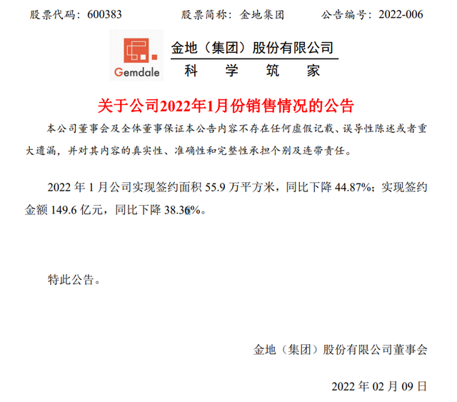 问题在于,在存量住房时代,房地产开发本身就没有太多的增量空间了。事实上,金地日前公布的2022年1月业绩也是相当惨淡:实现销售额149.6亿元,同比减少38.4%。
