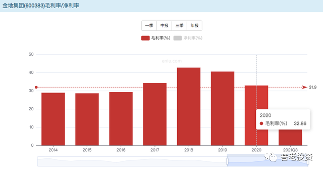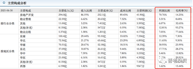 2021Q3金地集团的净利润暴跌了-33.72%,这确实是一个比较恐怖的数据,当然去年一年金地集团的经营数据都是比较差的,2021Q1净利润暴跌了-56.29%,2021Q2净利润暴跌了-38.79%,可以发现虽然业绩持续下滑,但是环比却好很多了,而金地集团净利润持续下滑的根源就是很多地区的毛利偏低: