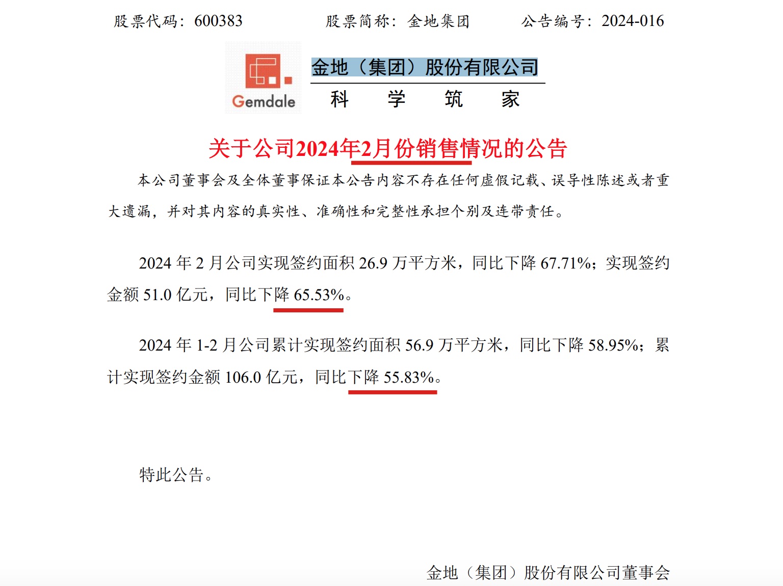 日前,金地(集团)股份有限公司(金地集团,600383.SH)发布关于公司2024年2月份销售情况的公告。