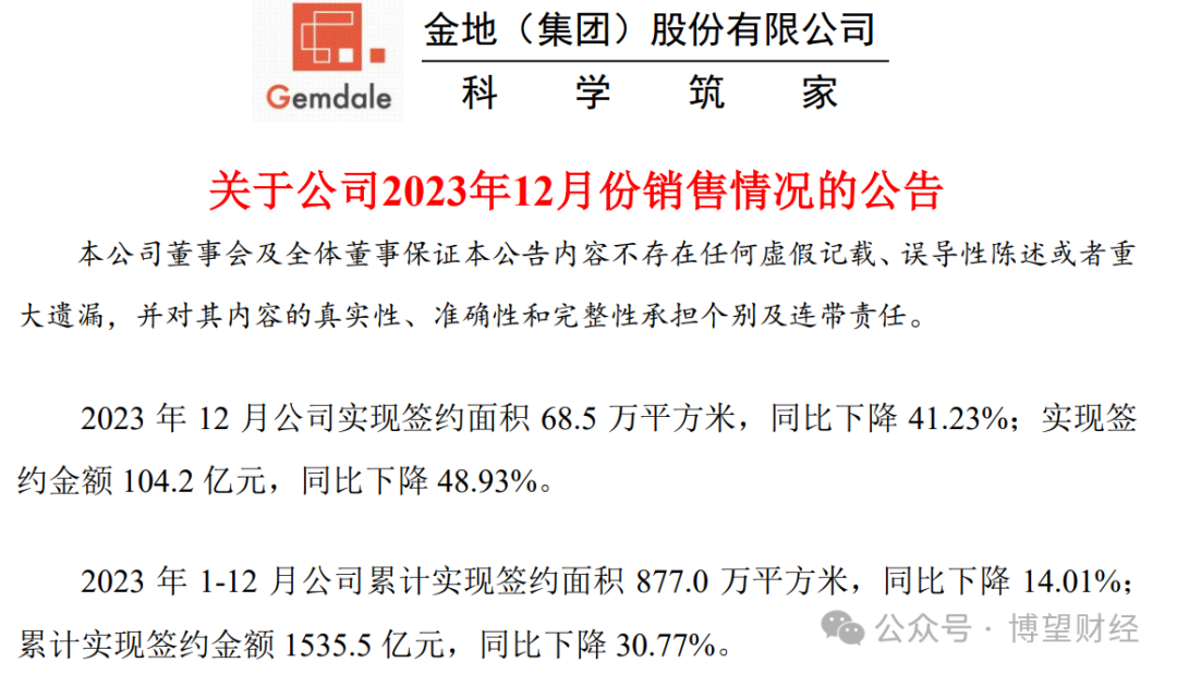 一方面,金地集团交出一份糟糕的业绩答卷,营收、利润双降。据2023年财报显示,全年金地集团实现营业收入981.25亿元,同比下降18.37%,房地产项目结算面积486.34万平方米,同比下降21.13%;结算收入854.69亿元,同比下降21.72%;实现归属于上市公司股东的净利润8.88亿元,同比下降85.48%。