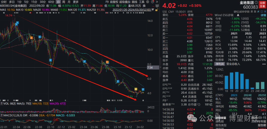 另一方面,金地集团在资本市场表现不佳,股价持续低迷。截止3月20日收盘,金地集团股价报收4.02元/股,较历时最高已经跌去逾七成,目前市值181亿元。