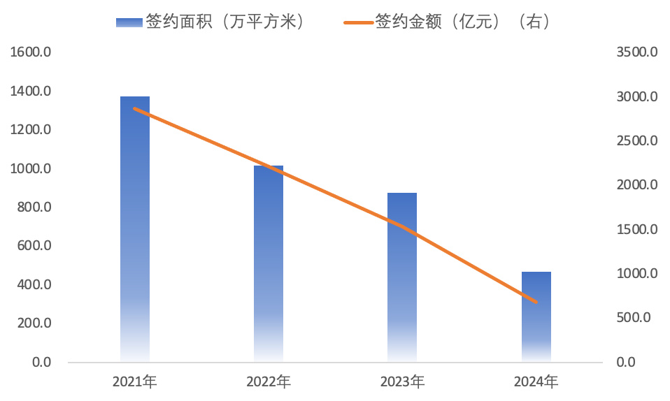 2024年,金地集团全年累计签约面积同比下降46.25%至471.4万平方米,累计签约金额同比下降55.39%至685.1亿元