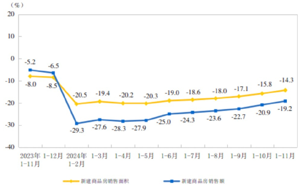 在销售端,据国家统计局发布的数据显示,2024年1月至11月,新建商品房销售面积和销售额的累计同比降幅延续收窄态势,分别已连续6个月、7个月收窄。克而瑞地产研究统计的数据显示,2024年1月至12月,百强房企实现销售操盘金额38840.2亿元,同比降低28.1%,但降幅较11月已收窄近2.6个百分点。