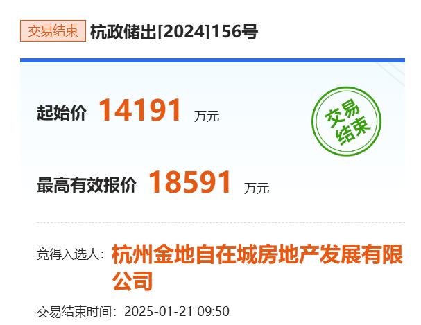 1月20日,金地集团全资子公司杭州金地自在城房地产发展有限公司经过23轮竞价、以1.8591亿元的总价竞得位于浙江省杭州市的临平老城区单元LP060203-1地块,溢价率31.01%,成交楼板价为11395元/平方米。