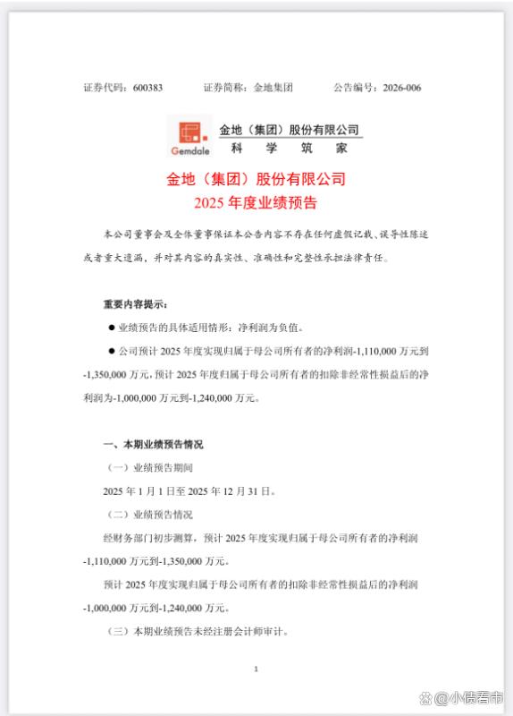 公告显示,金地集团预计2025年度实现归属于母公司所有者的净利润-111亿元到-135亿元,预计归母扣非净利润-100亿元到-124亿元。