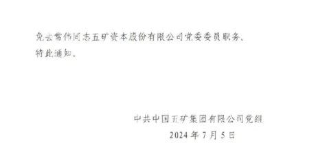 近日,中国五矿集团的一份党组文件在业界引起广泛关注。文件显示,五矿证券董事长常伟被免去五矿资本党委委员职务,并被聘任为集团公司专职外部董监事。常伟此前还担任五矿证券党委书记和董事长。