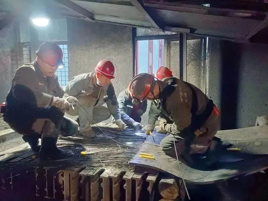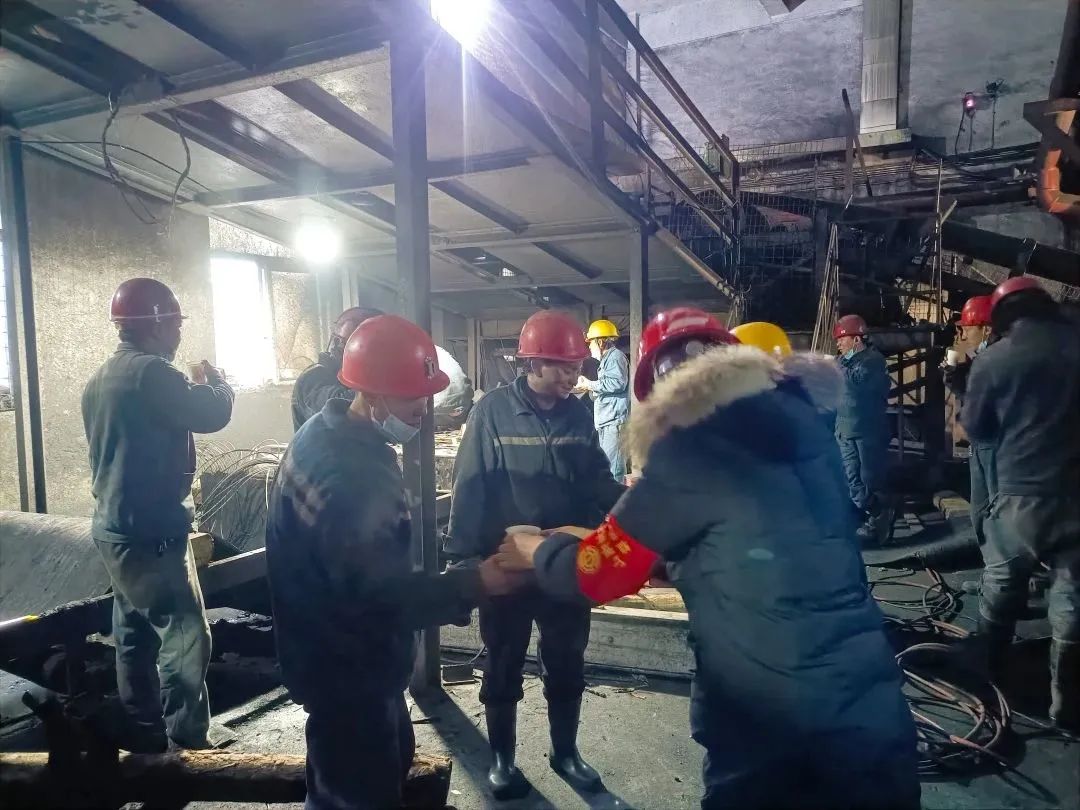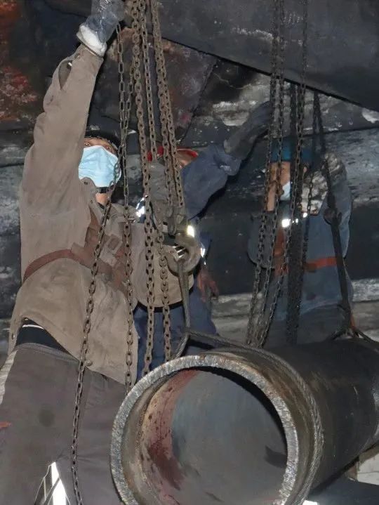 因为时间紧任务重,洗煤厂年近60的副厂长杨占群、代小明等始终坚守在皮带修补现场。工人师傅们也是没有一丝停歇,吃饭都是在现场匆匆吃完。当天户外温度低至零下,刺骨的寒风无时无刻不侵袭着检修作业的人员,在处理皮带内部钢丝绳时,大家轮流攻坚,手冻僵了就换下一个,总之,就是不能让检修工作停下来。大家干得热火朝天,可谓是,“户外寒风刺骨、检修汗流浃背。