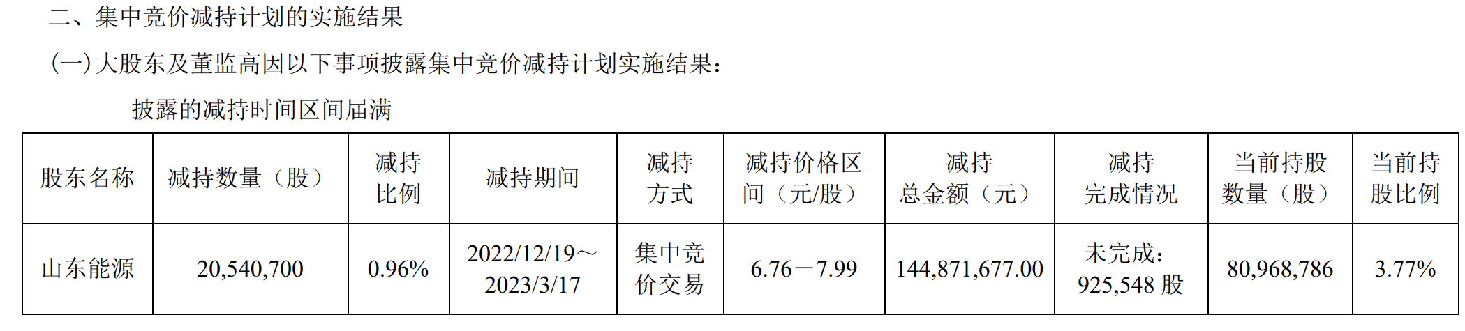 盘江股份于近日收到山东能源出具的《关于盘江股份减持计划实施结果的函》,截至2023年3月17日,山东能源通过集中竞价方式合计减持了20,540,700股,占公司当前总股本的0.96%,本次减持计划期限已届满且已实施完毕。