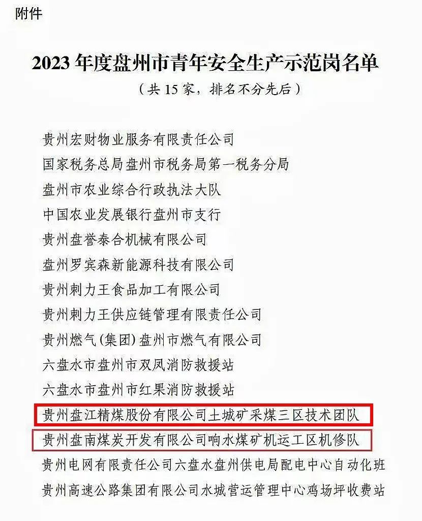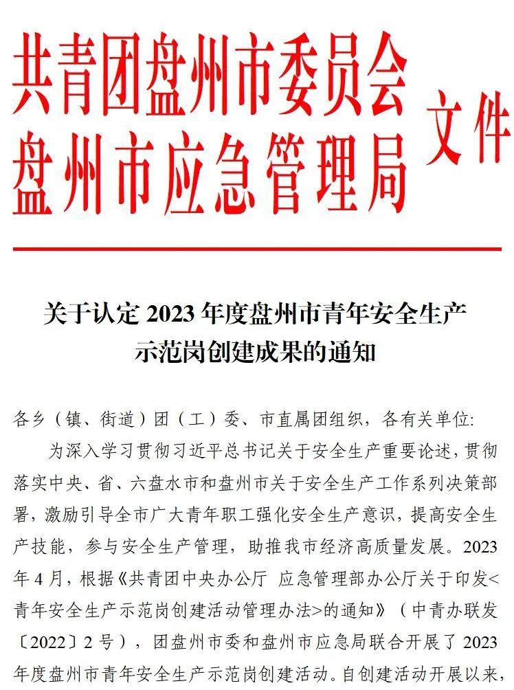 近日,共青团盘州市委员会、盘州市应急管理局联合下发《关于认定2023年度盘州市青年安全生产示范岗创建成果的通知》。土城矿采煤三区技术团队、盘南公司机运工区机修队荣获“2023年度盘州市青年安全生产示范岗”称号。