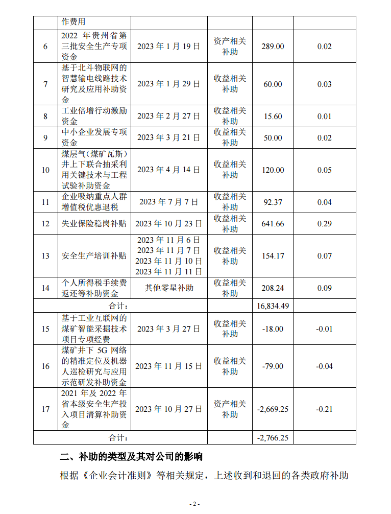 根据公告显示,该公司累计收到各类政府补助资金 16,834.49 万元,其中:收益相关补助资金 1,342.04 万元,占公司最近一期经审计净利润的 0.60%;资产相关补助资金 15,492.45 万元,占公司最近一期经审计净资产的 1.23%。清算退还科技研发课题补助资金和省本级安全生产投入资金2,766.25 万元。