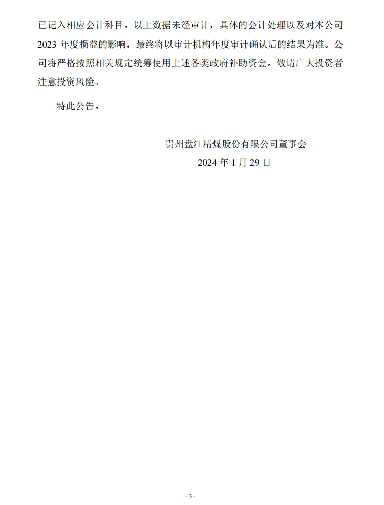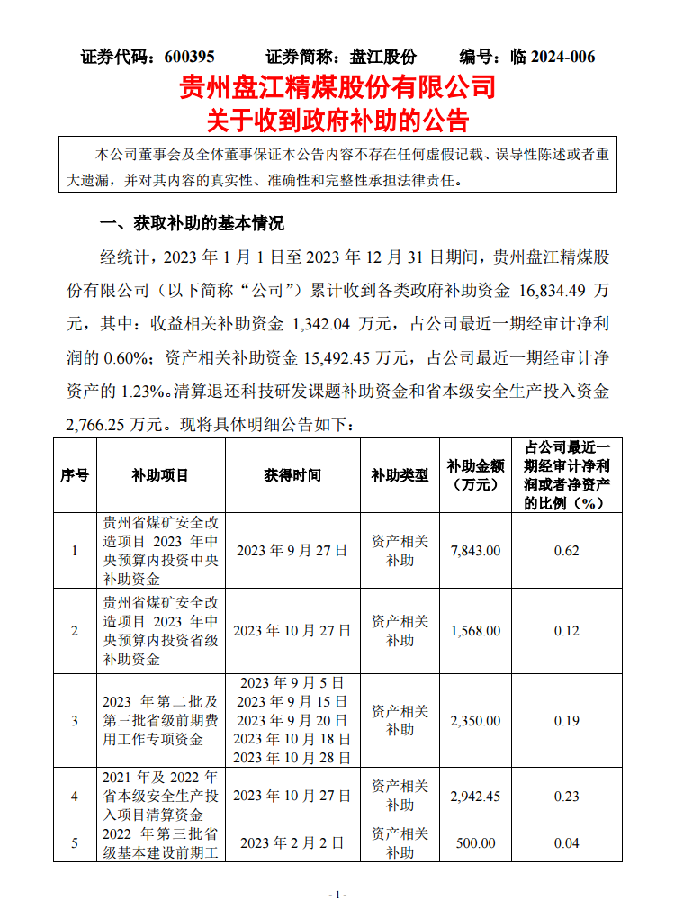 国际能源网获悉,近日,盘江股份发布关于收到政府补助的公告。