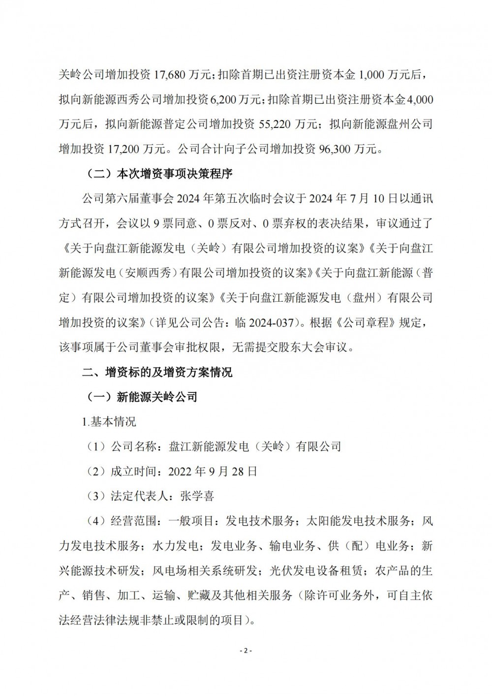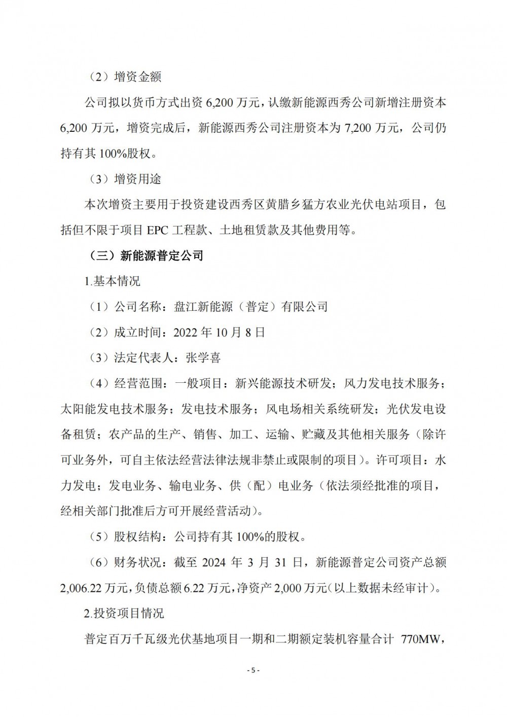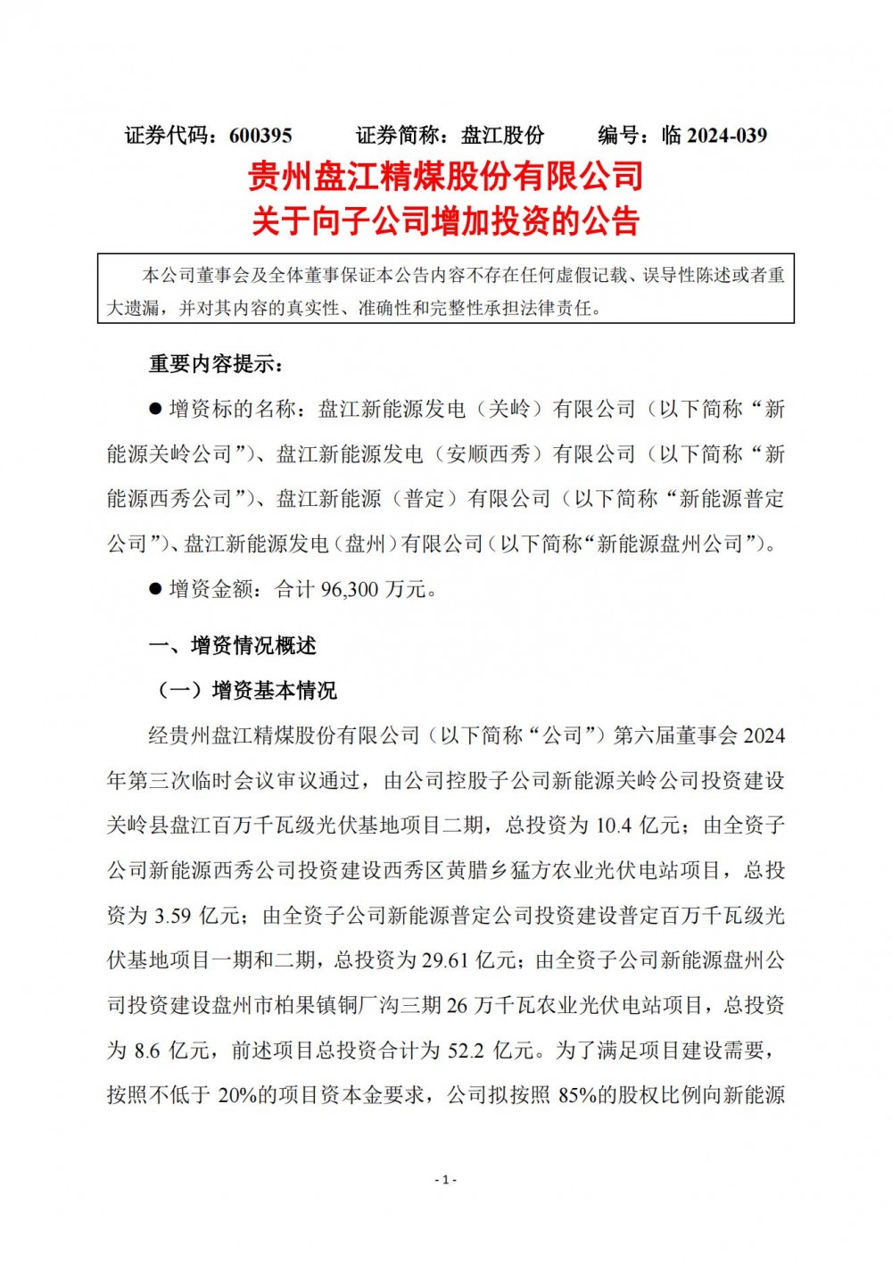 公告表示,经贵州盘江精煤股份有限公司(以下简称“公司”)第六届董事会 2024年第三次临时会议审议通过,由公司控股子公司新能源关岭公司投资建设关岭县盘江百万千瓦级光伏基地项目二期,总投资为10.4亿元;由全资子公司新能源西秀公司投资建设西秀区黄腊乡猛方农业光伏电站项目,总投资为3.59亿元;由全资子公司新能源普定公司投资建设普定百万千瓦级光伏基地项目一期和二期,总投资为29.61亿元;由全资子公司新能源盘州公司投资建设盘州市柏果镇铜厂沟三期26万千瓦农业光伏电站项目,总投资为8.6亿元,前述项目总投资合计为52.2亿元。为了满足项目建设需要,按照不低于20%的项目资本金要求,公司拟按照85%的股权比例向新能源关岭公司增加投资17680万元;扣除首期已出资注册资本金1000万元后,拟向新能源西秀公司增加投资6200万元;扣除首期已出资注册资本金4000万元后,拟向新能源普定公司增加投资55220万元;拟向新能源盘州公司增加投资17200万元。公司合计向子公司增加投资96300万元。本次增加投资用于子公司光伏电站项目建设。
