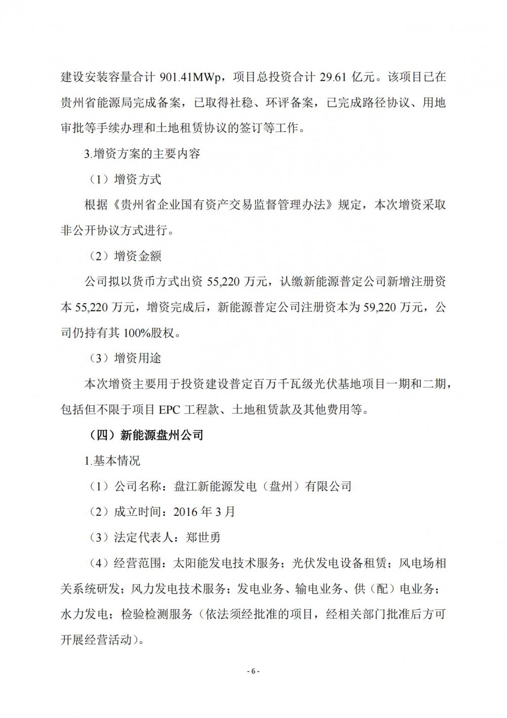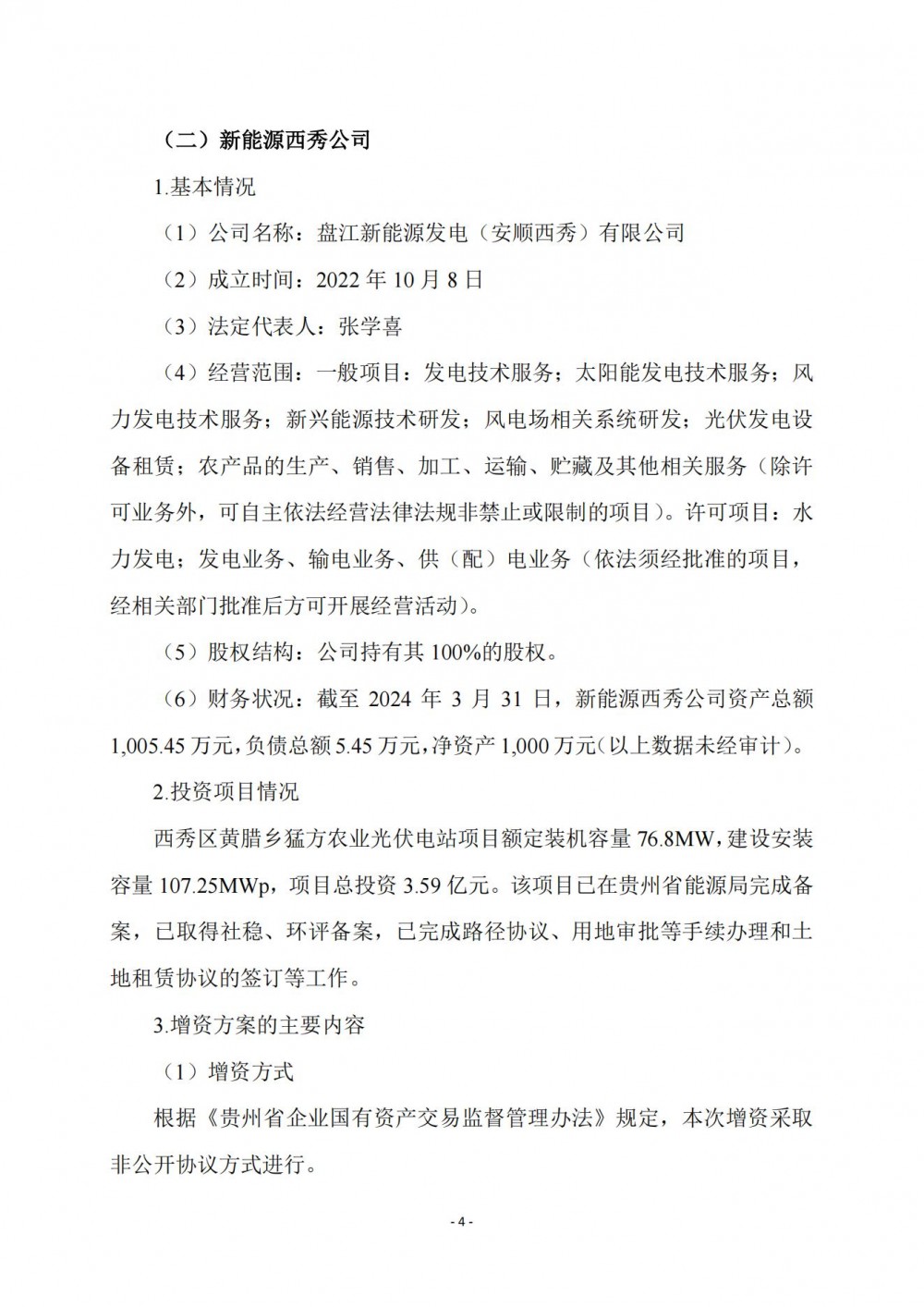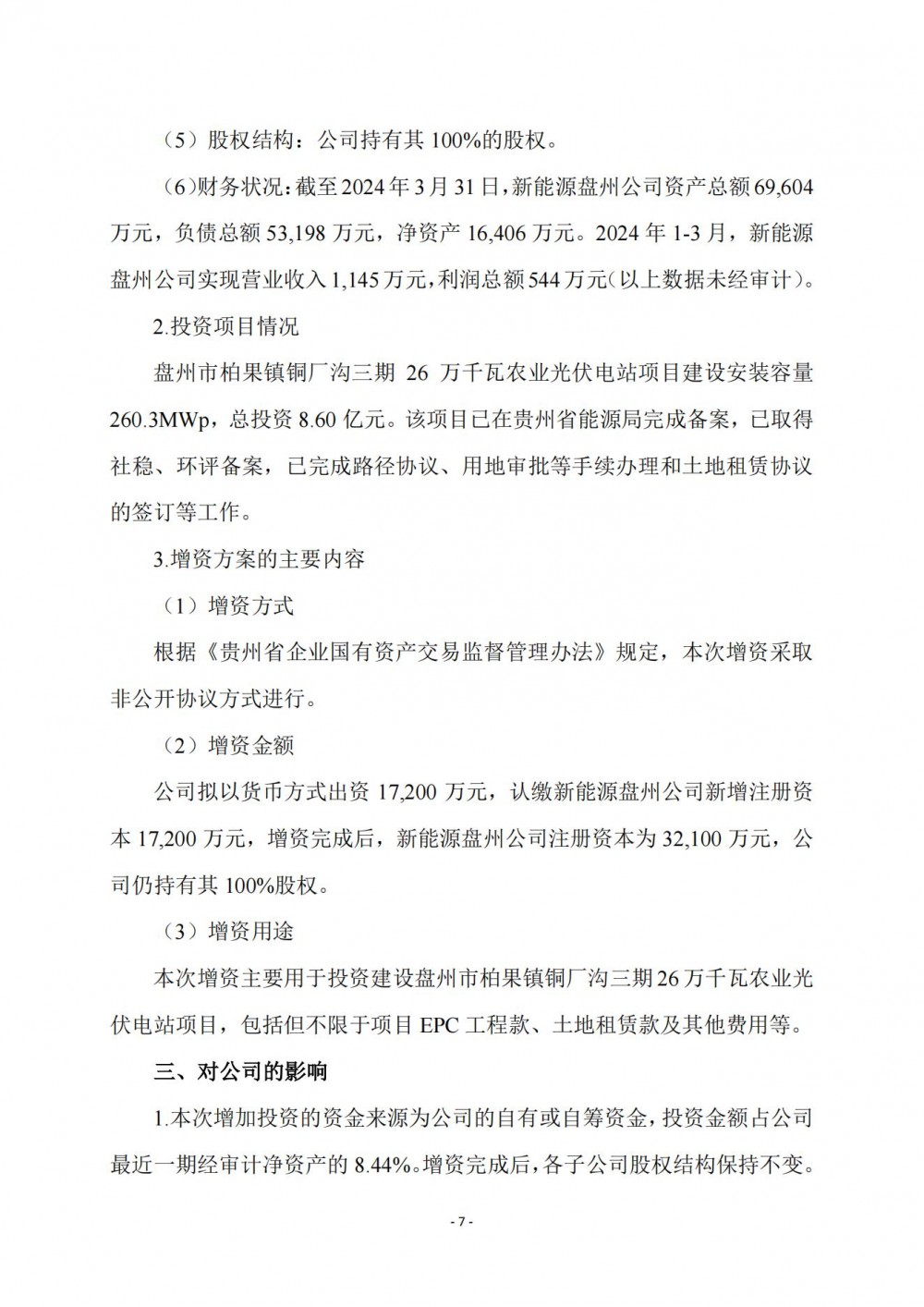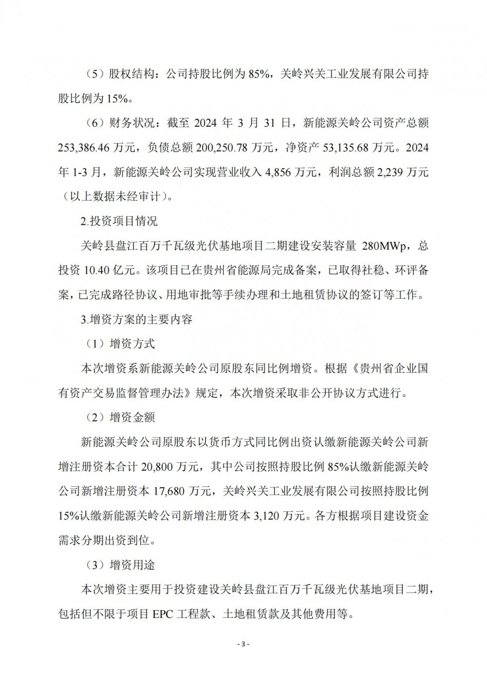 公告表示,经贵州盘江精煤股份有限公司(以下简称“公司”)第六届董事会 2024年第三次临时会议审议通过,由公司控股子公司新能源关岭公司投资建设关岭县盘江百万千瓦级光伏基地项目二期,总投资为10.4亿元;由全资子公司新能源西秀公司投资建设西秀区黄腊乡猛方农业光伏电站项目,总投资为3.59亿元;由全资子公司新能源普定公司投资建设普定百万千瓦级光伏基地项目一期和二期,总投资为29.61亿元;由全资子公司新能源盘州公司投资建设盘州市柏果镇铜厂沟三期26万千瓦农业光伏电站项目,总投资为8.6亿元,前述项目总投资合计为52.2亿元。为了满足项目建设需要,按照不低于20%的项目资本金要求,公司拟按照85%的股权比例向新能源关岭公司增加投资17680万元;扣除首期已出资注册资本金1000万元后,拟向新能源西秀公司增加投资6200万元;扣除首期已出资注册资本金4000万元后,拟向新能源普定公司增加投资55220万元;拟向新能源盘州公司增加投资17200万元。公司合计向子公司增加投资96300万元。本次增加投资用于子公司光伏电站项目建设。