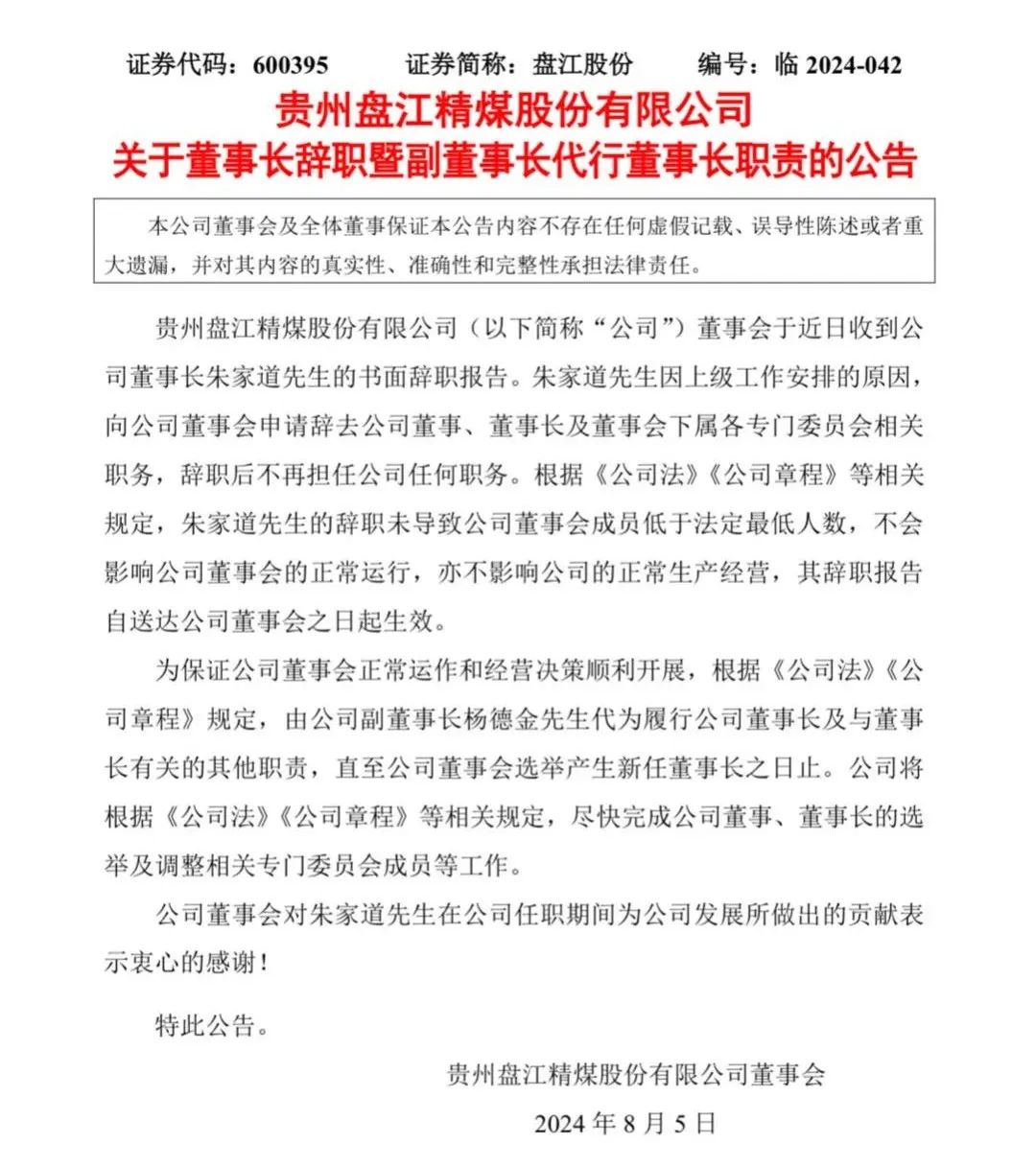 盘江股份8月5日公告称,董事会于近日收到公司董事长朱家道先生的书面辞职报告。朱家道先生因上级工作安排的原因,向公司董事会申请辞去公司董事、董事长及董事会下属各专门委员会相关职务,辞职后不再担任公司任何职务。