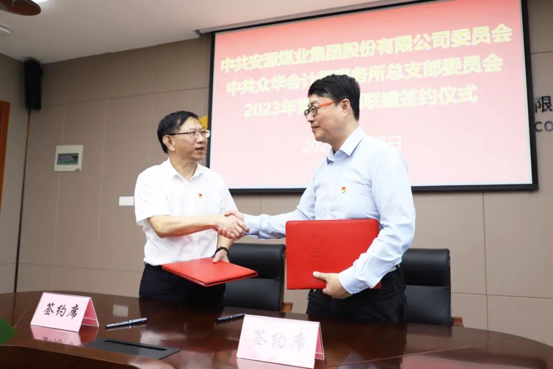 为深入学习贯彻党的二十大精神,推动党建和业务深度融合,探索建立“优势互补、资源共享、共同发展、双向共赢”的联动机制,9月7日,安源煤业党委与众华会计师事务所党总支开展党建共建签约活动。安源煤业党委书记、董事长余子兵,众华会计师事务所党总支书记、首席合伙人陆士敏出席活动并签约。公司党委副书记熊永忠,财务总监张海峰,董秘钱蔚出席签约活动。
