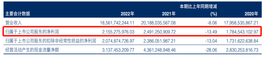 财报显示,2022年,海澜之家集团实现营业收入185.62亿元,同比下降8.06%;归属于母公司股东的净利润为21.55亿元,同比下降13.49%。这也是继2020年后,海澜之家再次录得营收利润双下滑。