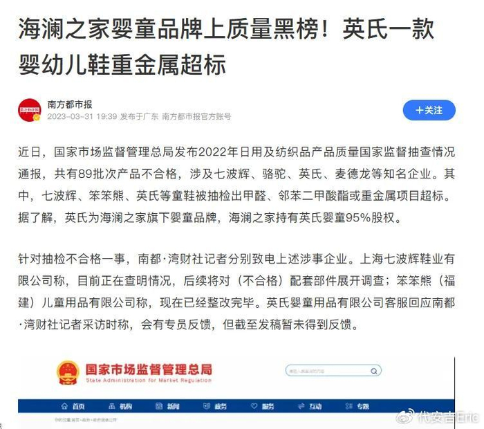 其中比较严重的当属 海澜之家 旗下品牌英氏的婴幼儿鞋被国家市监局通报重金属超标。