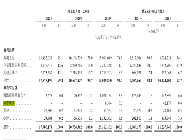 截至2025年9月底,公司全品牌门店数量为7241家。其中,直营门店2220家,占比达30.66%。线下的门店遍布31个省(自治区、直辖市),覆盖80%以上的县、市,并进一步拓展到东南亚海外市场。即使业绩倒退,截至目前,公司仍是唯一一个年收入突破人民币100亿元的中国男装品牌。