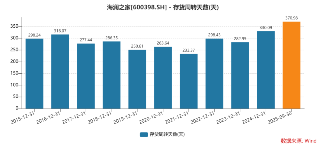 回到运营层面,海澜之家的存货规模从2020年的74.16亿元逐步扩大至2025年上半年的102.55亿元。存货周转天数也达到322.9天,同比增加50天。