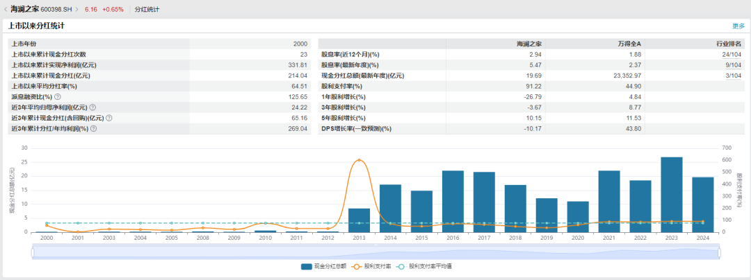 自上市以来,公司累计分红达到了214.04亿元,总分红率为64.51%,另外,海澜包含ipo在内的股权融资为170.35亿,分红融资比为1.26倍,分红数据还算不错。