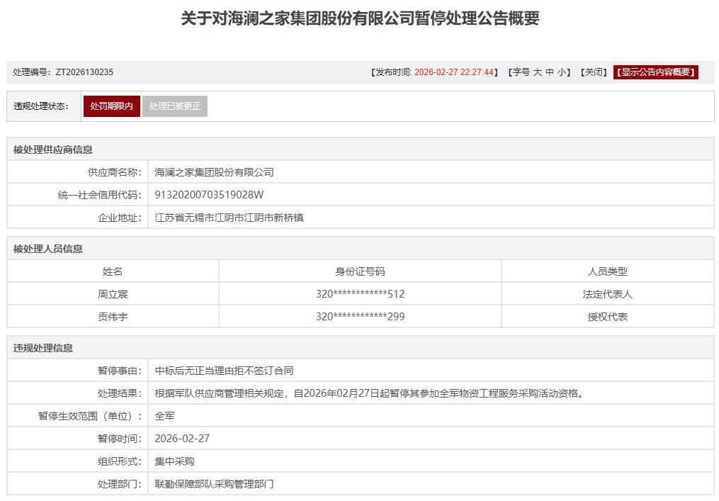 公告显示,海澜之家集团股份有限公司(统一社会信用代码:91320200703519028W)因“中标后无正当理由拒不签订合同”,违反了军队供应商管理相关规定。自2026年2月27日起,海澜之家将被暂停参加全军(含各军兵种及武警部队)物资工程服务采购活动资格。一同被处理的还包括该公司的法定代表人周立宸,以及授权代表贡伟宇。