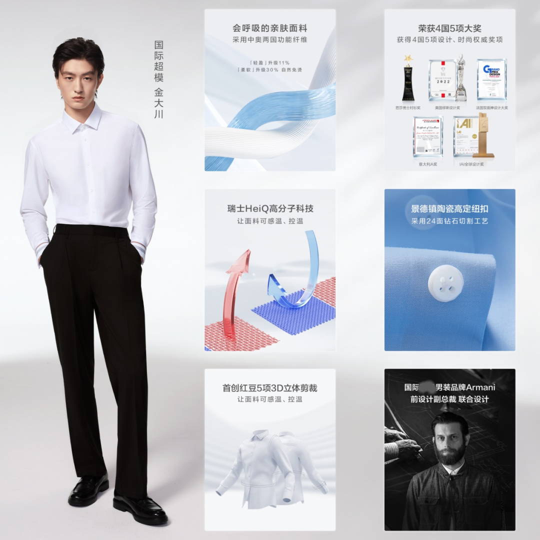 这件“叫好又叫座”的衬衫,系红豆男装与前ARMANI男装设计副总裁联手打造,引进瑞士HeiQ智能温控、奥地利兰精莫代尔等黑科技;并一举包揽了中国芭莎男士年度男士衬衫奖、法国双面神国际创新设计大奖、美国MUSE奖、意大利A奖、IAI全球设计奖等五项知名大奖。