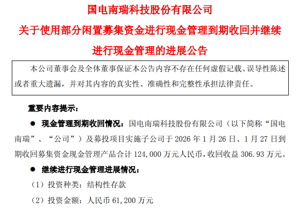 1月27日晚间,国电南瑞(600406)公告,披露公司及募投项目实施子公司近期完成12.4亿元闲置募集资金现金管理产品的到期收回,并使用部分闲置资金继续进行结构性存款投资。