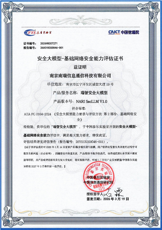 近日,国电南瑞自主研发的瑞智安全大模型(NARI SecLLM)通过中国信息通信研究院中国泰尔实验室的安全大模型能力评测,成为能源行业首家通过该项权威认证的网络安全大模型。