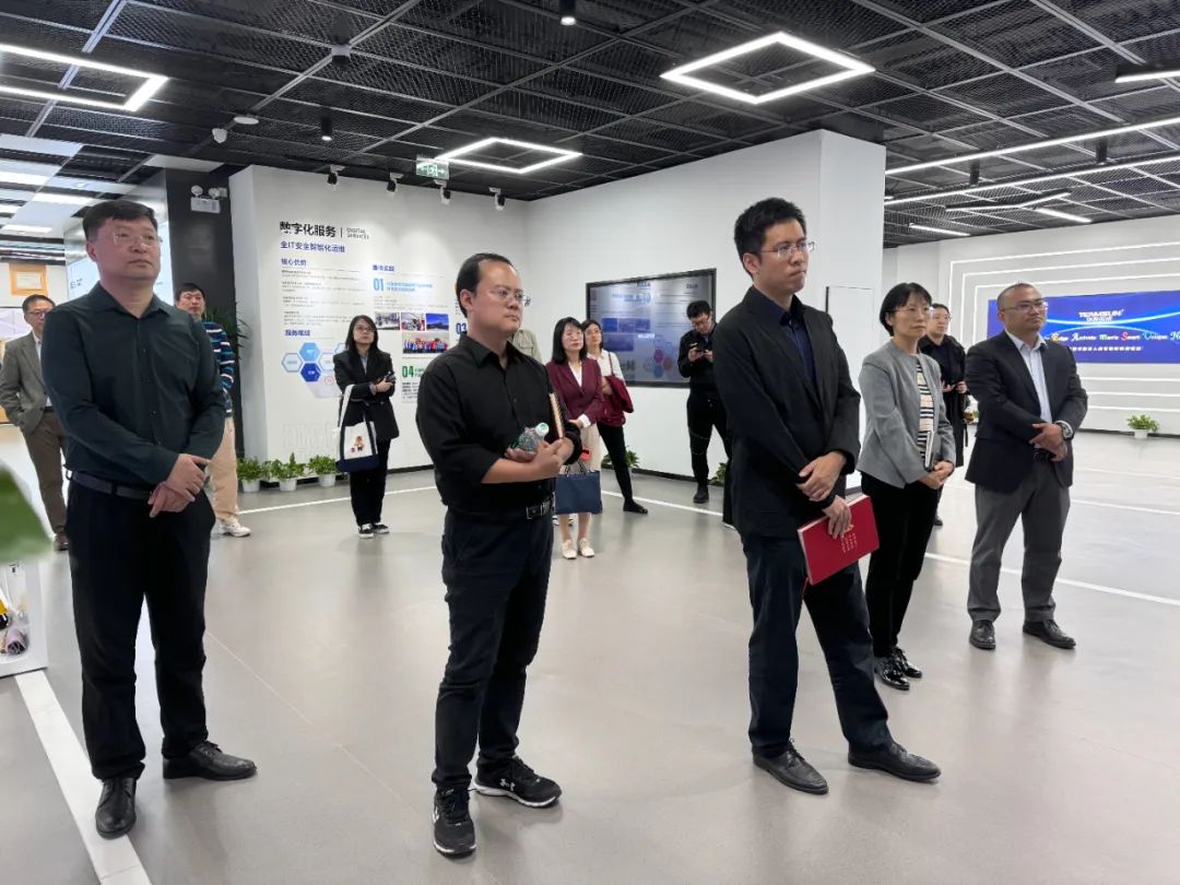 于腾飞主任一行在华胜天成董事长助理兼行政总监徐光荣的带领下,参观了公司展厅,了解了公司近30年的发展历程、技术创新以及业务布局等情况。