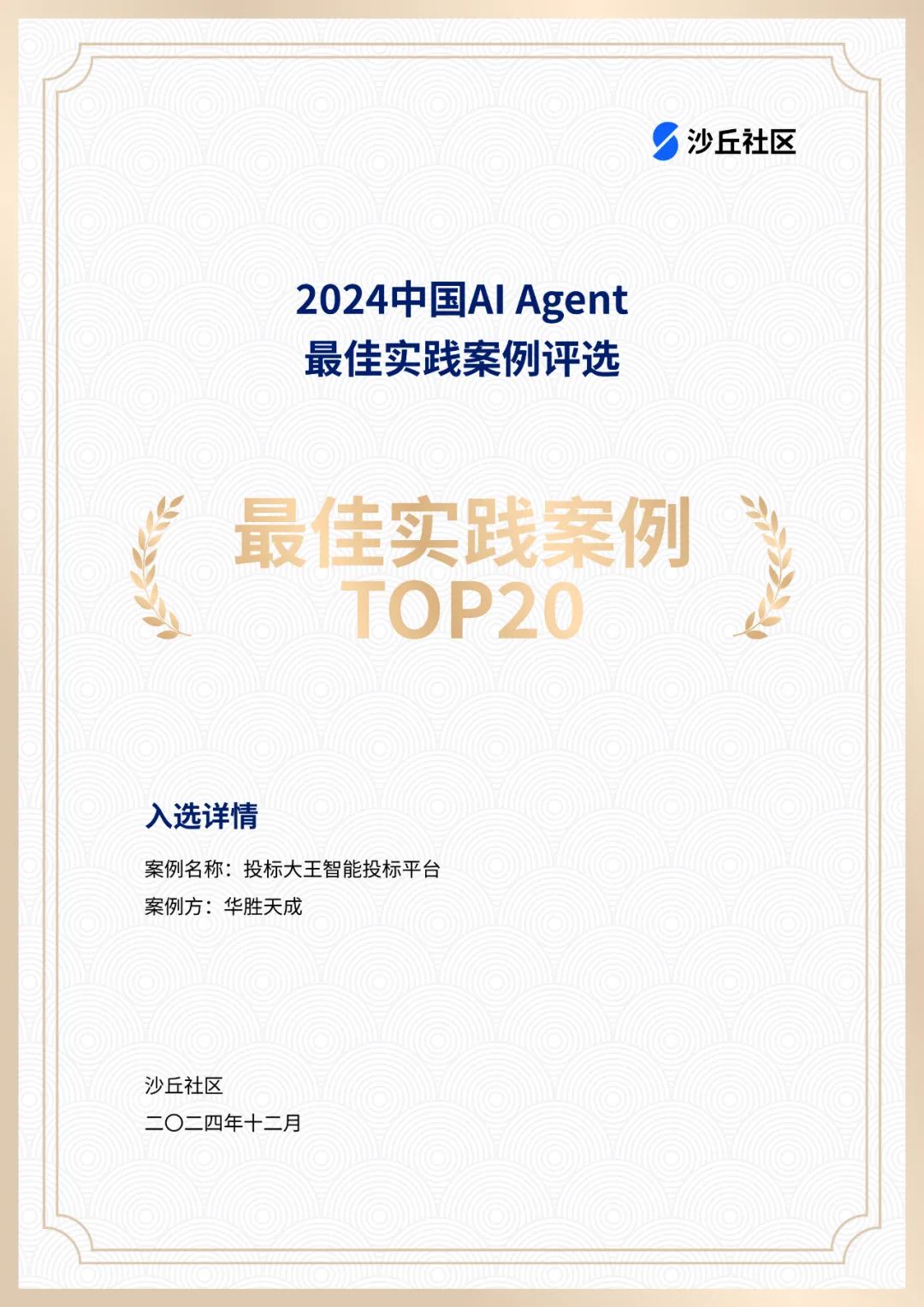 近日,华胜天成自主研发的AI驱动智能投标系统“投标大王”荣登《2024中国AI Agent最佳实践案例TOP20》榜单。该榜单聚焦金融、通信、医疗、能源、互联网等行业的优秀AI Agent应用,展现了技术从概念到实践的跨越式发展。此次投标大王入选,不仅彰显了华胜天成在大模型技术应用领域的卓越实力,也体现了公司以技术驱动行业变革的使命与担当,成为行业智能化发展的重要推动者。