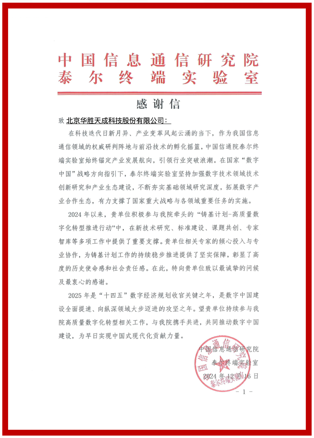 近日,华胜天成收到来自中国信息通信研究院泰尔终端实验室的感谢信,对过去一年华胜天成在由中国信通院牵头的“铸基计划”中对企业高质量数字化转型推进行动作出的积极贡献表示了肯定和感谢。