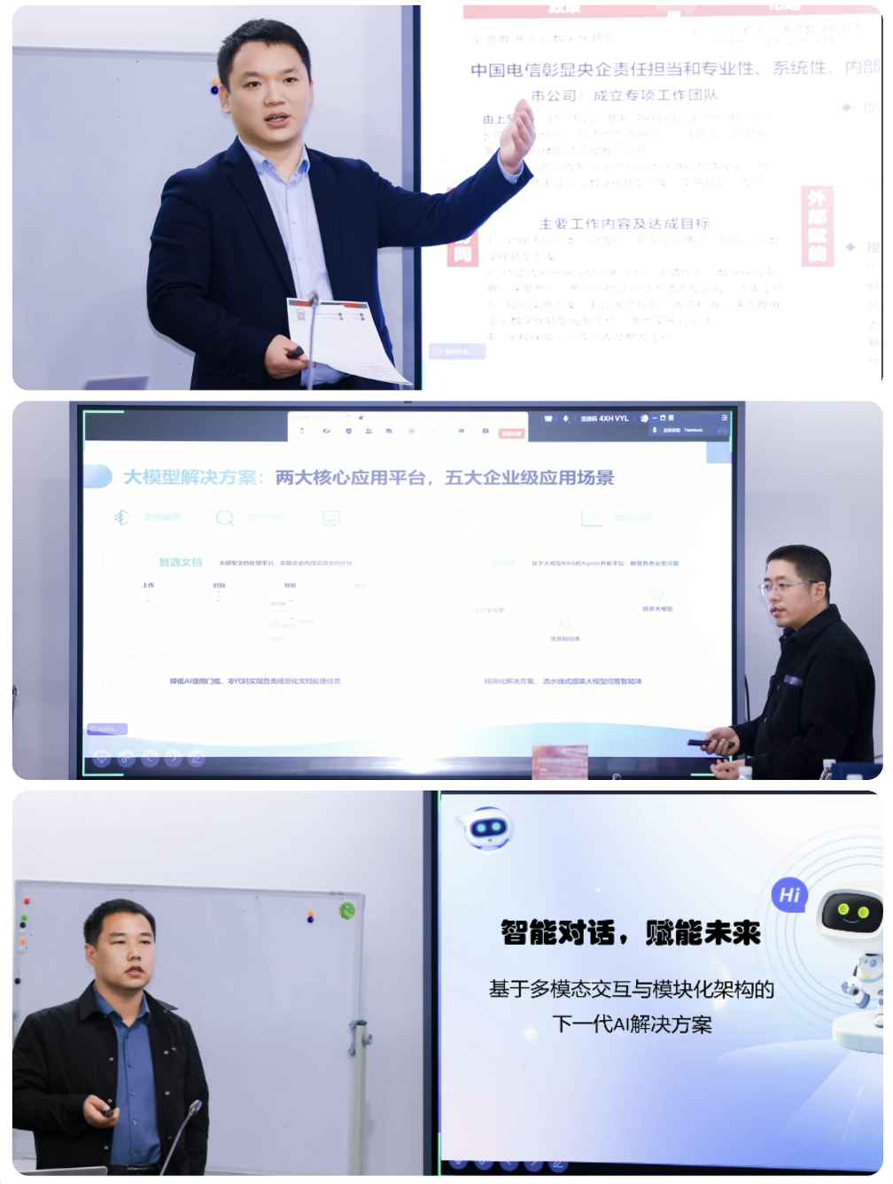 在活动中,校友们积极分享了各自公司的产品与解决方案,展示了人工智能技术在不同领域的创新应用和实践成果。中国电信尚文耀介绍了中国电信的智能化综合性数字信息基础设施,致力于打造“高速泛在、天地一体、云网融合、智能敏捷、绿色低碳、安全可控”的先进网络,为企业和用户提供全方位的数字化服务,推动数字信息基础设施的升级与创新。金证优智合伙人大模型业务负责人曲丁分享了基于大模型的两大核心应用平台,即“智遇文档”和“智友Agent”,这些平台适用于文档抽取、审核、撰写、知识问答和数据分析等五大企业级应用场景,助力企业提升运营效率和智能化水平。玄凤科技创始人路文强表示,玄凤科技基于多模态交互与模块化架构,开发了广泛应用于英语学习、图像识别、家电控制、个性音色、音乐播放和智能玩具控制等场景的AI解决方案,推动多领域智能化发展。这些分享不仅展示了校友们在各自领域的专业能力,也为与会嘉宾提供了丰富的行业洞察和合作机会。