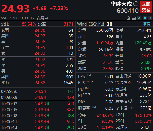 从阶段性表现看,华胜天成自7月24日启动本轮行情以来,区间最大涨幅已达156.87%,今日盘中再创新高至25.25元,成为近期A股市场最受瞩目的热点标的之一。