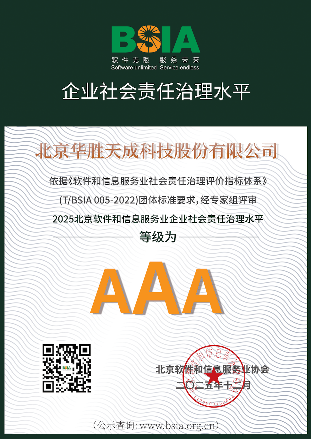 华胜天成获得“2025北京软件和信息服务业企业社会责任治理水平AAA级”认证