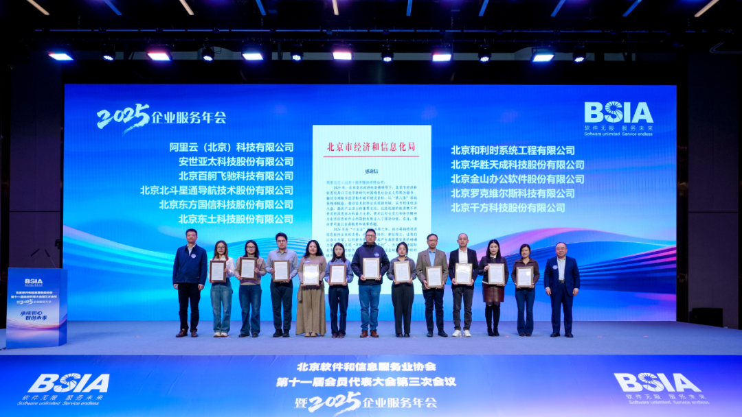 近日,北京软件和信息服务业协会第十一届会员代表大会第三次会议暨2025企业服务年会在京召开。会上,华胜天成凭借多年来在技术创新、综合竞争力以及社会责任等方面的卓越表现,再次入选“2025北京软件和信息技术服务综合实力百家企业”、“2025北京软件核心竞争力企业(平台赋能型)”。同时,获得“2025北京软件和信息服务业企业社会责任治理水平AAA级认证”。这一系列荣誉,是对华胜天成深耕行业27年的全面肯定,更彰显了其作为中国数智化创新标杆企业的引领地位。