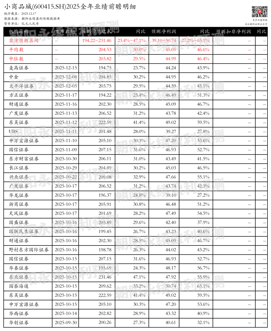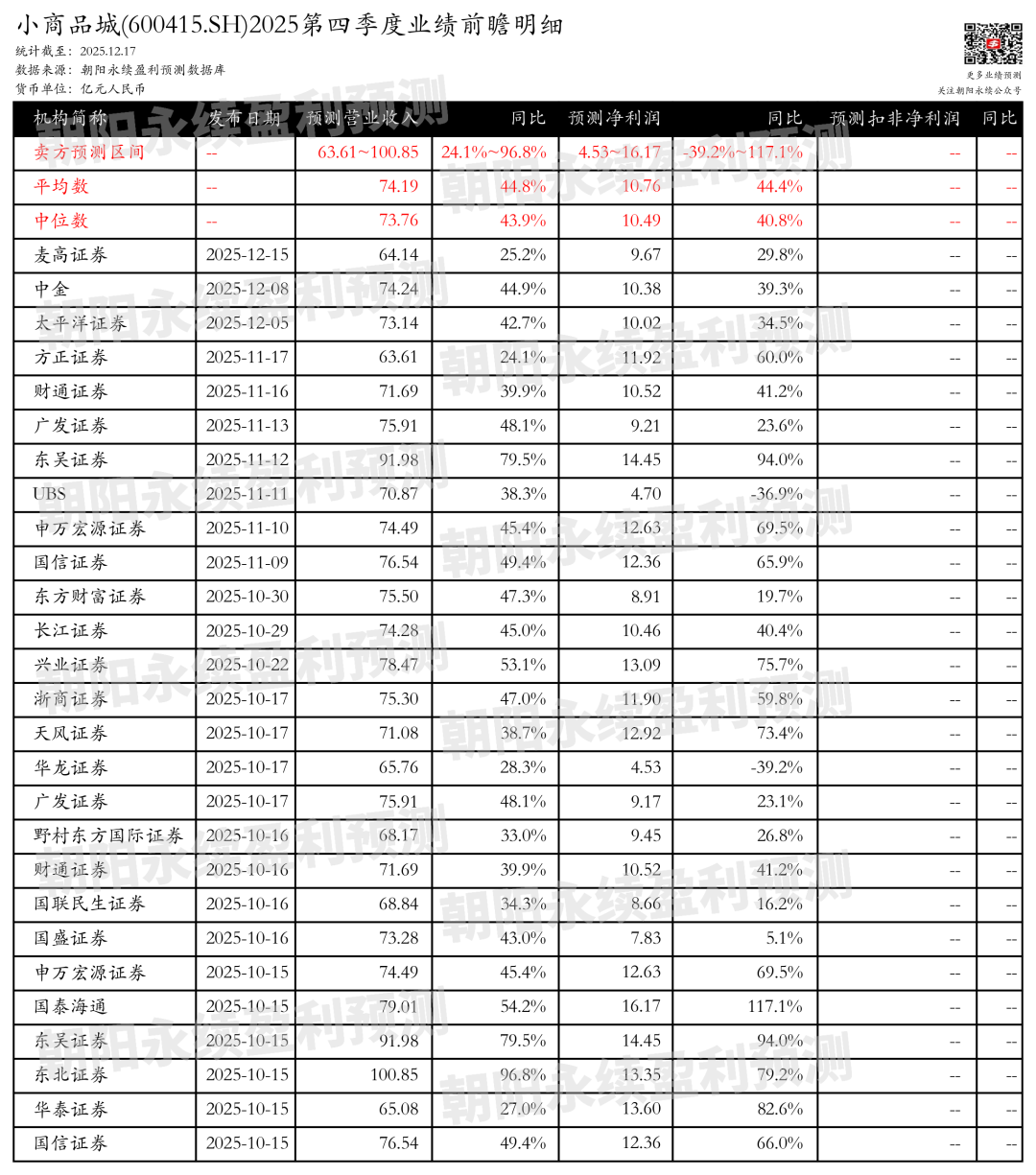 截至2025年12月17日,根据朝阳永续季度业绩前瞻数据: