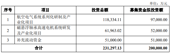 湘电股份于2025年3月21日披露的募集说明书显示,本次向特定对象发行募集资金总额拟不超过人民币200,000.00万元(含本数),扣除发行费用后拟用于航空电气系统系列化研制及产业化项目、磁悬浮轴承高速电机系统研发及产业化项目和补充流动资金。