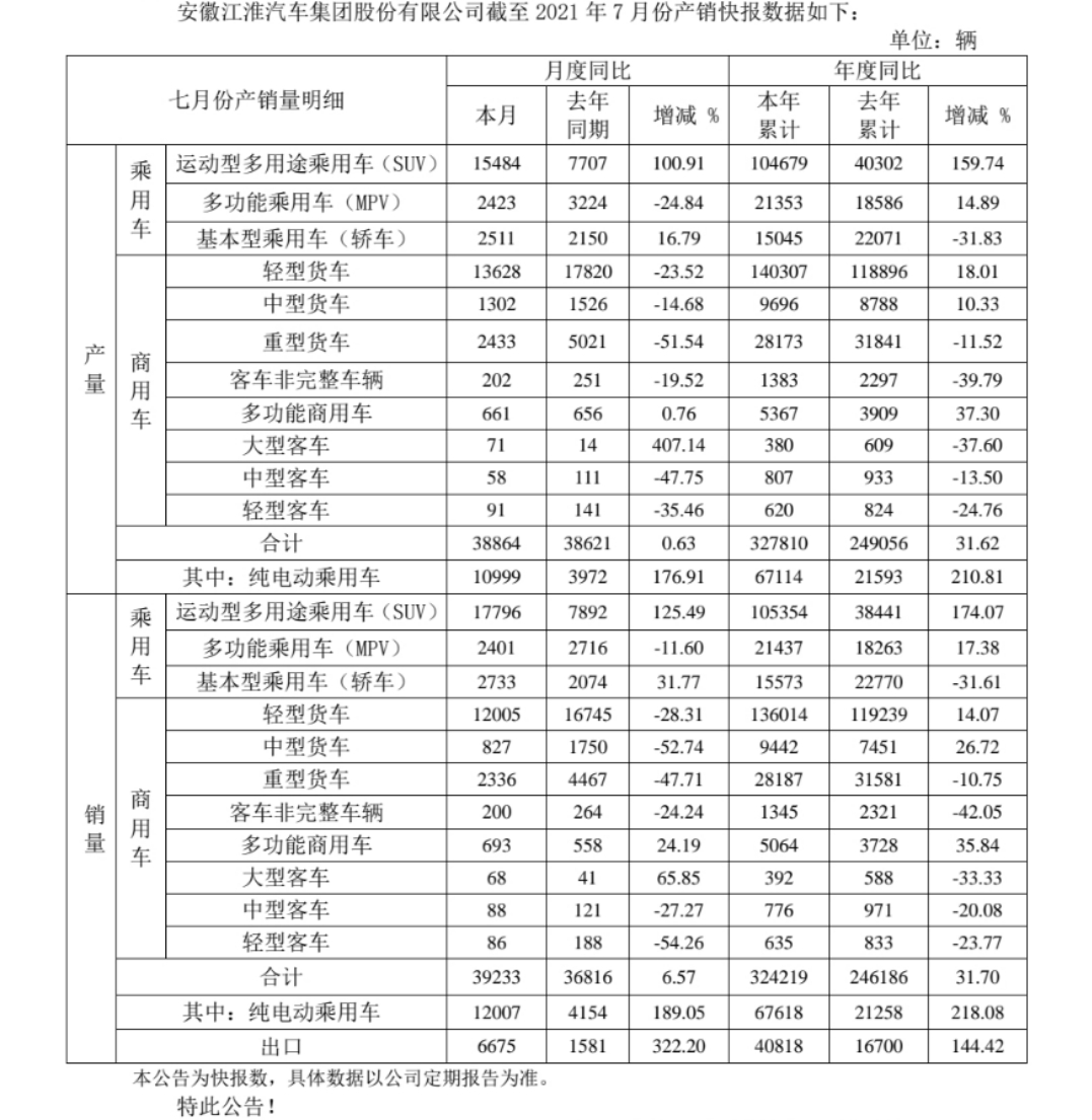 8月6日,安徽江淮汽车集团股份有限公司(以下简称:江淮汽车)发布2021年7月产销快报。数据显示,江淮汽车乘用车和商用车7月销量同比增加6.57%,月销量超3.92万辆。
