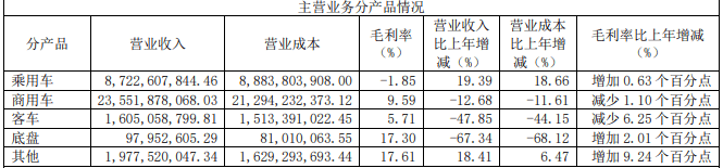 但江淮汽车乘用车板块是项不赚钱的业务。其乘用车毛利率为-1.85%,较上年的-2.48%增加0.63个百分点;商用车毛利率为9.59%,较上年减少减少1.10个百分点。