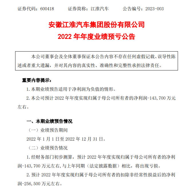 1月30日晚间,江淮汽车(SH600418,股价17.51元,市值382.42亿元)发布2022年年度业绩预告称,公司预计2022年实现归属于母公司所有者的净利润为-14.37亿元左右。