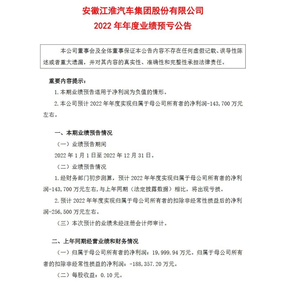 更严重的是,江淮的产能利用率仅71.15%,超过20万辆的产能被闲置。由此,江淮汽车也陷入巨额亏损状态。2022年,江淮汽车预计亏损14.37亿元左右,创下了有史以来的亏损记录,近六年累计亏损超91亿元。