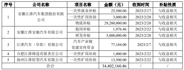 江淮汽车:截至2月底,累计收到与收益相关政府补贴约3440.22万元