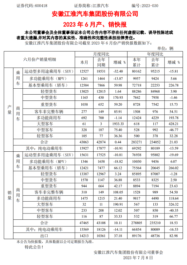 日前,安徽江淮汽车集团股份有限公司(证券简称:江淮汽车,证券代码:600418)发布6月产销数据,6月,江淮汽车产量为4.31万辆,同比增长0.44%,销量为4.75万辆,同比增长10.11%;1-6月累计产量28.33万辆,同比增长21.03%,累计销量27.88万辆,同比增长18.53%。