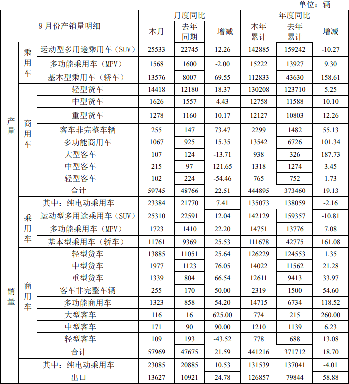 江淮汽车:前9月整车销量合计44.12万辆,同比上涨18.7%