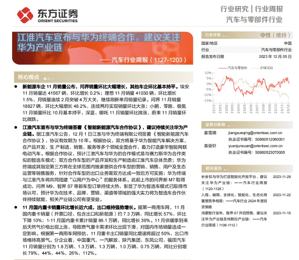 【研报推荐】江淮汽车宣布与华为终端合作 建议关注华为产业链